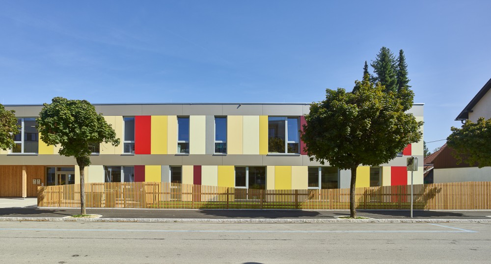 Es wird eine Bebauung in zwei Baukörpern vorgeschlagen. Der Hauptbaukörper im Westen ist zweigeschossig und schließt städtebaulich an die Bebauung entlang der Linzerstraße an. So wird einerseits eine Abgrenzung entlang der Straße, und andererseits ein geschützter Grünbereich dahinter geschaffen. Dieser Hauptbaukörper beherbergt die Krabbelstube im Erdgeschoss und den Kindergarten über beide Geschosse. An der Ostseite des Grundstückes wird der Hort bzw. die Tagesbetreuung errichtet, dieser kann somit komplett eigenständig errichtet und betrieben werden. Diese Bebauung kann sowohl in einer als auch in zwei getrennten Bauphasen verwirklicht werden, ohne den Betrieb im bestehenden Kindergarten zu stören. So kann auf die Schaffung eines Ausweichquartieres während der Errichtung verzichtet werden. Durch die Positionierung der Gebäude entsteht eine neue „Campus“- Situation. Die drei Bildungseinrichtungen Kindergarten mit Krabbelstube, Hort und Volksschule gruppieren sich um einen neu organisierten Grünraum. ARCHITEKTUR Die Baumassen fügen sich durch ihre geringe Höhe unaufdringlich ins Ortsbild ein. Der Haupteingang des Kindergartens und der Krabbelstube befindet sich an der Westseite des Gebäudes, wo auch die Busbucht liegt. Er wird durch einen Gebäudeeinschnitt gekennzeichnet und vor Witterung geschützt. Die Parkplätze für den Kindergarten sind an der Nordseite des Gebäudes, an der Rosseggerstraße. Kindergarten / Krabbelstube: Von einer gemeinsamen Eingangszone gelangt man direkt in die Krabbelstube und den Kindergarten. Die multifunktionale Gruppe liegt zwischen den beiden und kann auf diese Weise entweder der einen oder der anderen Nutzung zugewiesen werden. Das Zentrum des Kindergartens ist der großzügige Essbereich, der mittels Luftraum zweigeschossig ist, er kann auch für Veranstaltungen mit dem Bewegungsraum im Erdgeschoss zusammengelegt werden. So entsteht ein weiträumiger Veranstaltungsbereich mit direktem Gartenzugang. Die Erschließungszonen sind so gestaltet, dass sie sich immer an den Eingängen zu den Gruppenräumen zu gemeinsam genutzten Spielecken erweitern. Sämtliche Gruppenräume sind gemäß ihrer Nutzungszeiten nach Osten ausgerichtet. Die Servicezonen befinden sich im Westen in Richtung Straße. Hort / Tagesbetreuung: Der Hort hat seinen Haupteingang im Norden, an der Rosseggerstraße, wo sich auch dessen dazugehörige Parkplätze befinden. Es gibt einen zweiten Eingang im Süden, über den die Kinder direkt aus der Volksschule den Hort betreten können. Die Erschließungszone verbindet die beiden Zugänge und gliedert sich in zwei kleinere Spielzonen und einen großen Essbereich, der in räumlicher Verbindung zum Werk- und Erlebnisraum steht. Diese beiden Räume können ihrerseits zu einem großen Veranstaltungsbereich zusammengelegt werden. Die Gruppenräume des Hortes orientieren sich ihrer Nutzungszeit gemäß nach Südwesten. Die klar gegliederten Fassaden werden durch verschiebbare Beschattungselemente aus Holz belebt.